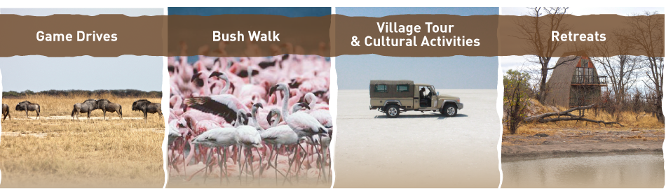 Binoculars ready, guests are treated to a ramble at Nata Bird Sanctuary. Bird-life is prolific throughout the year and with the diverse vegetation, our experienced guides are not too challenged when it comes to providing tickers with the opportunity to site both the rarely seen and the equally beautiful pelicans within the area. Whilst staying at Pelican Lodge guests are treated to a pan drive into Makgadikgadi pans and apart from its spectacular view which interchanges throughout the year, guests will also treat their eyes to a wide range of wild animals which include Ant Eater, Springbok, Black Backed Jackal, Wildebeest and others.