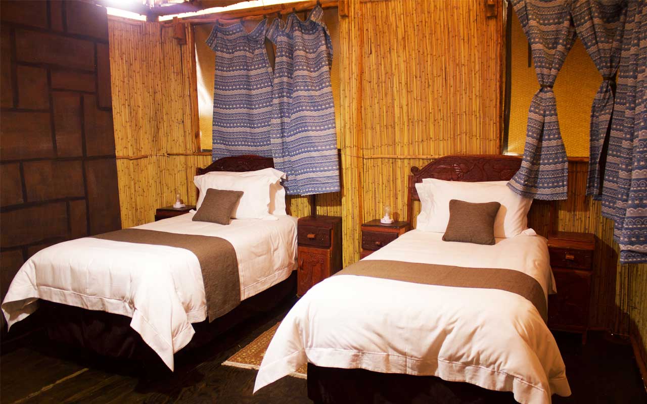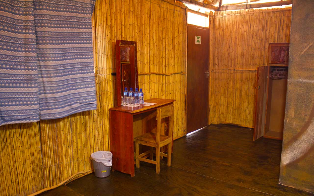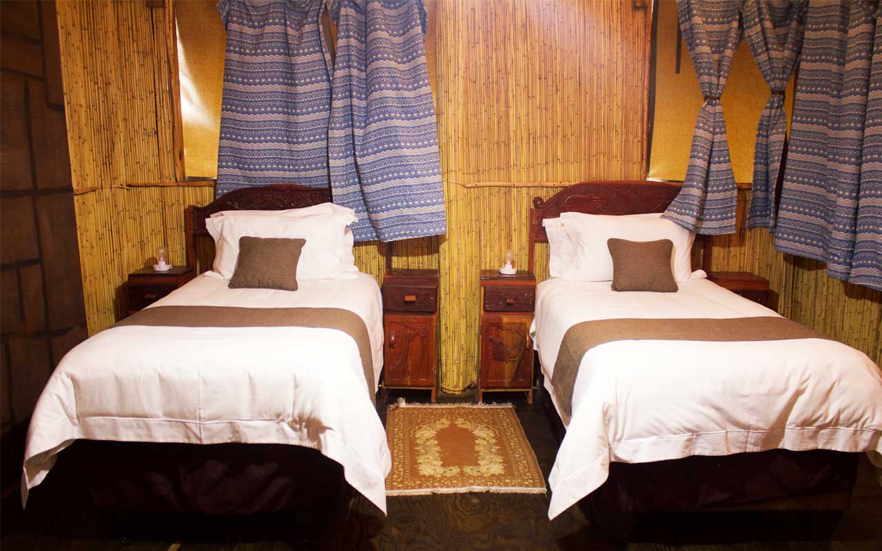 Completely surrounded by nature, you will be intrigued by the sounds of the wild while you gaze at the scenic evening stars from the balcony of your chalet. Dzibanana has 11 ensuite shower twin chalets.